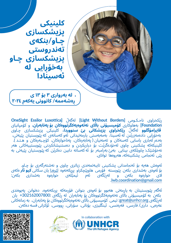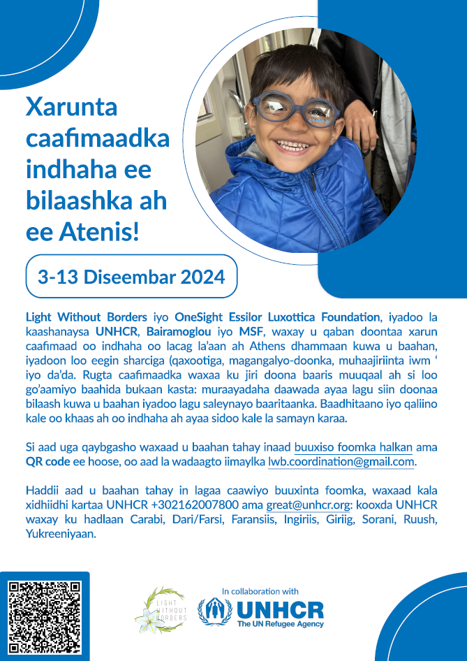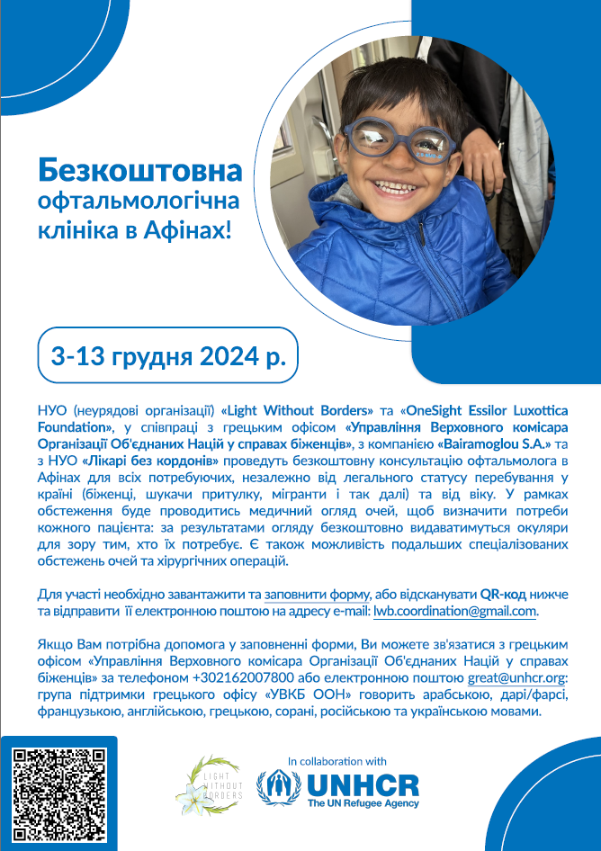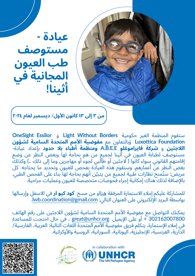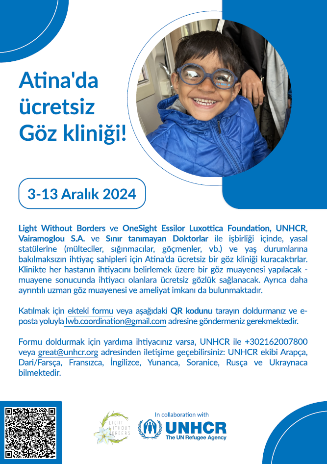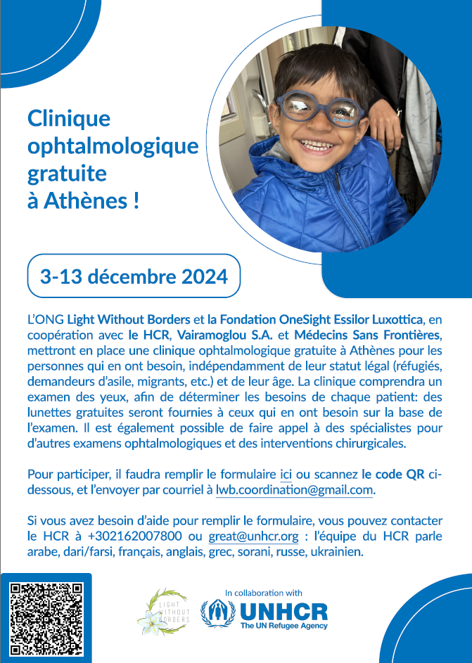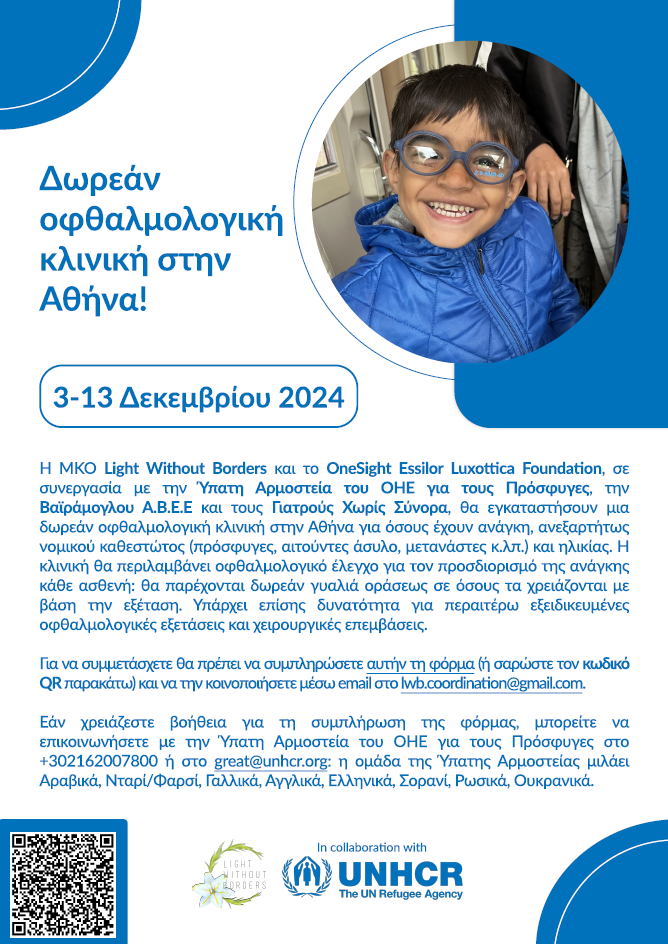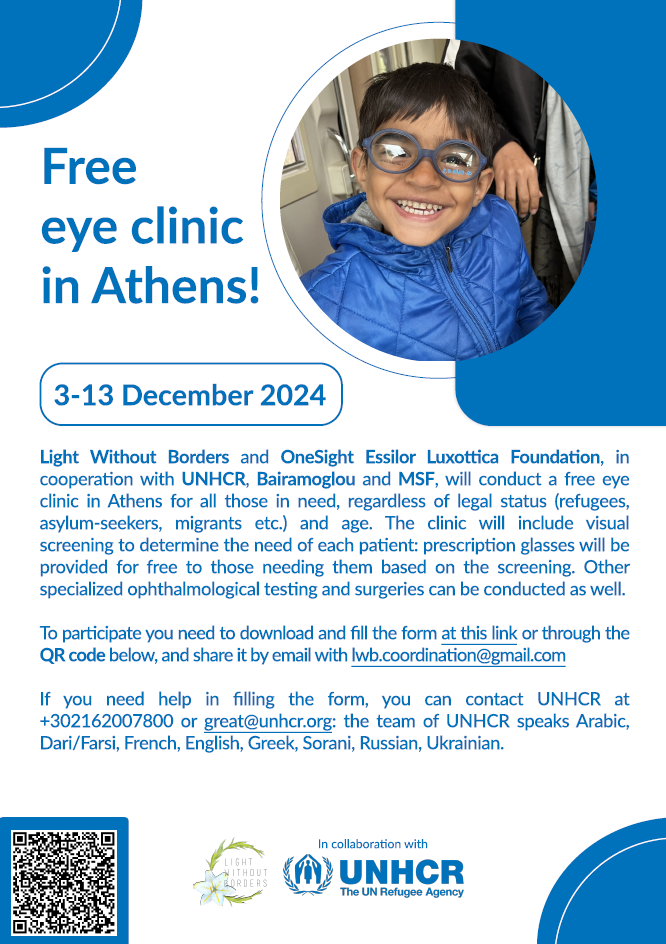 Light Without Borders and OneSight Essilor Luxxotica Foundation, in cooperation with UNHCR, Bairamoglou and MSF, will conduct a free eye in Athens for all those in need, regardless of legal status (refugees, asylum-seekers, migrants etc.) and age. The clinic will include visual screening to determine the need of each patient: prescription glasses will be provided for free to those needing them based on the screening.